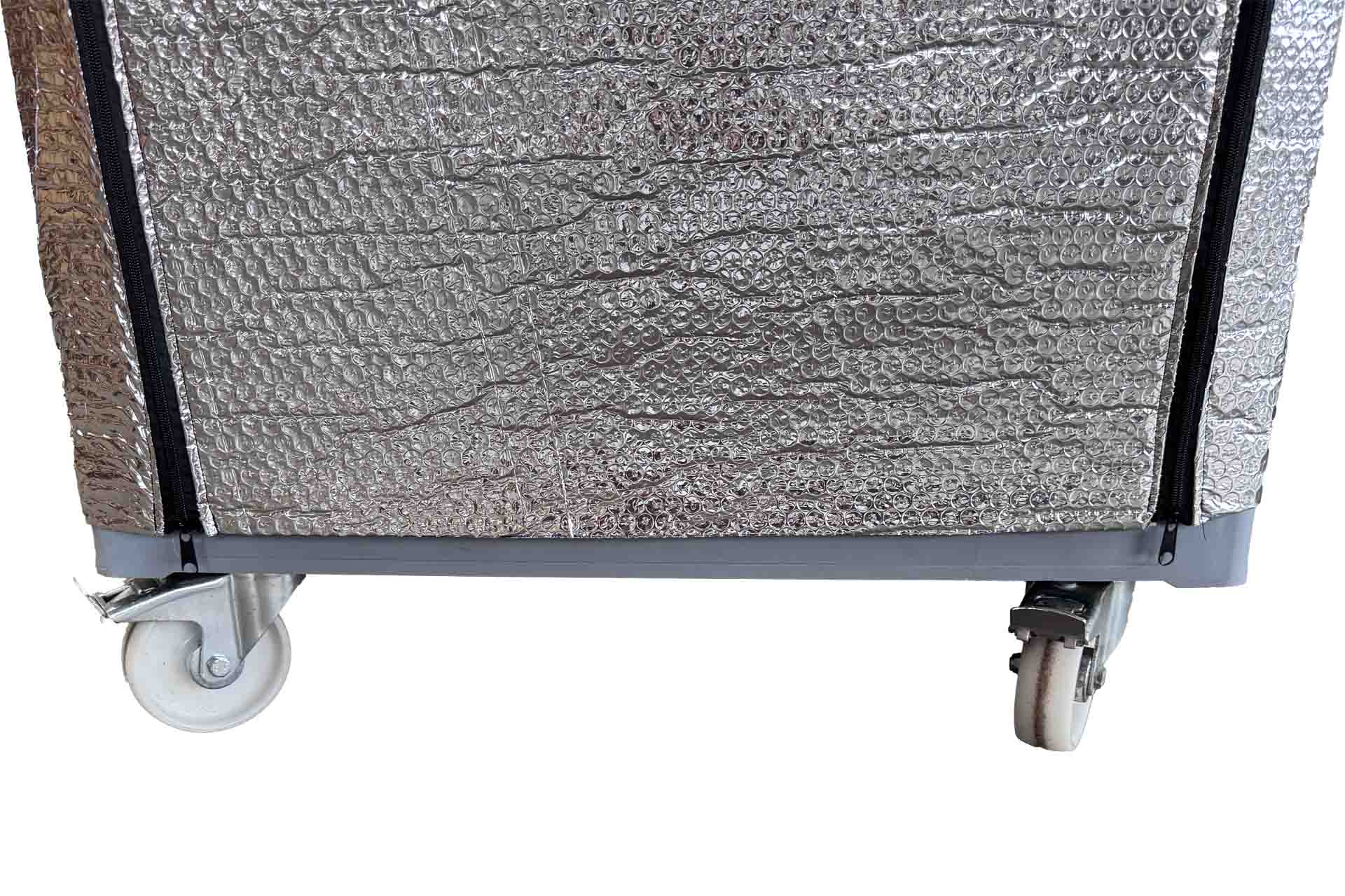 Eine Thermoschutzhaube ist eine isolierende Abdeckung, die über einen Rollbehälter gezogen wird, um die Temperatur der transportierten oder gelagerten Waren zu stabilisieren. Sie schützt den Inhalt vor äußeren Einflüssen wie Hitze, Kälte oder Temperaturschwankungen und hilft, die Produktqualität zu erhalten.